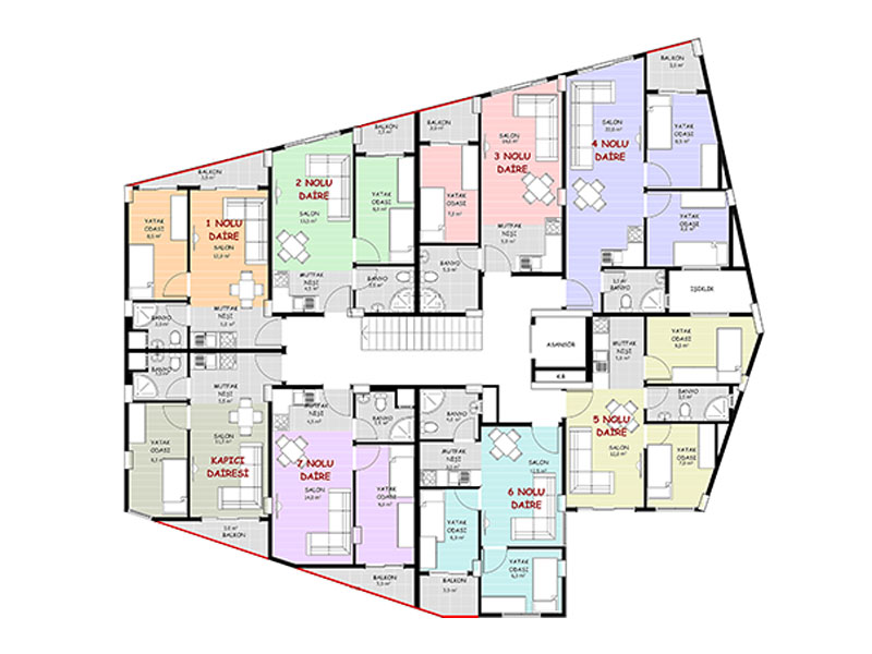 1+1 Daireler Brüt: 40 m2, 42 m2, 45 m2, 2+1 Daireler Brüt 43, 44.5, 45, 46.5 ve 60 m2