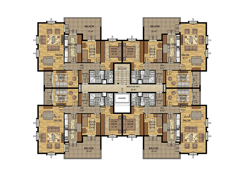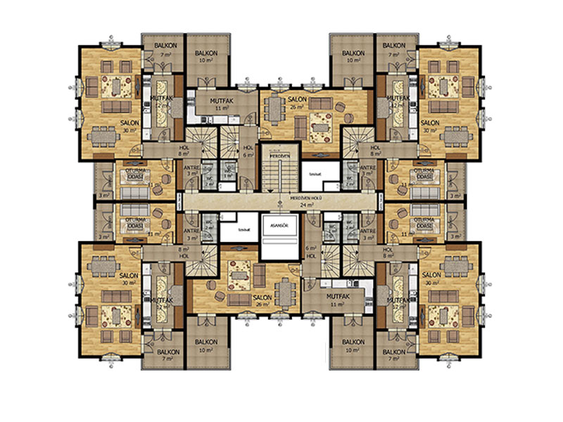 - 3+1 Daireler Brüt: 150 m2, Balkonlu: 122 m2, Net: 104 m2