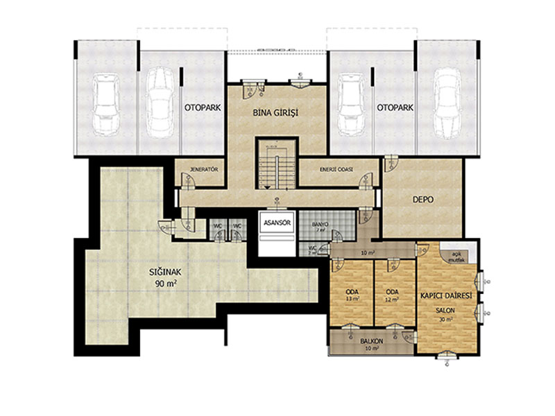 Kapalı Otoparklar, Kapıcı Dairesi, Sığınak, Depo Alanı,Enerji ve Jeneratör Odası